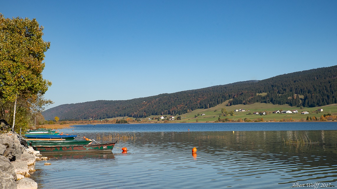 Je suis aux Rousses, station de sports d'hiver jurassienne. Mais aujourd'hui, pas de neige. La saison automnale est bien là et les arbres face au lac me le prouvent.